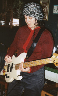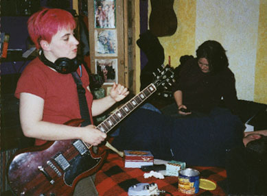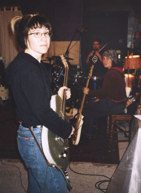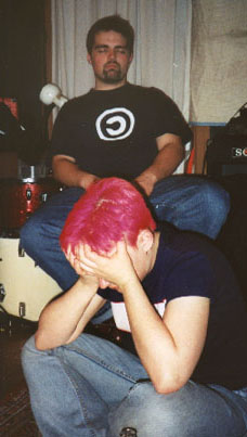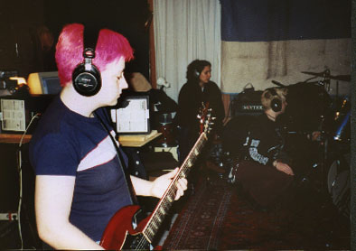 Recording Speech for Heated Hearts, February through April 2002 We recorded the basic tracks at The Launching Pad in Brooklyn. Here's the scene, with the studio's Chris Lee (at left) assisting while our engineer and co-producer Hillary Johnson (center) mics the drums for Jake's impending battery. |